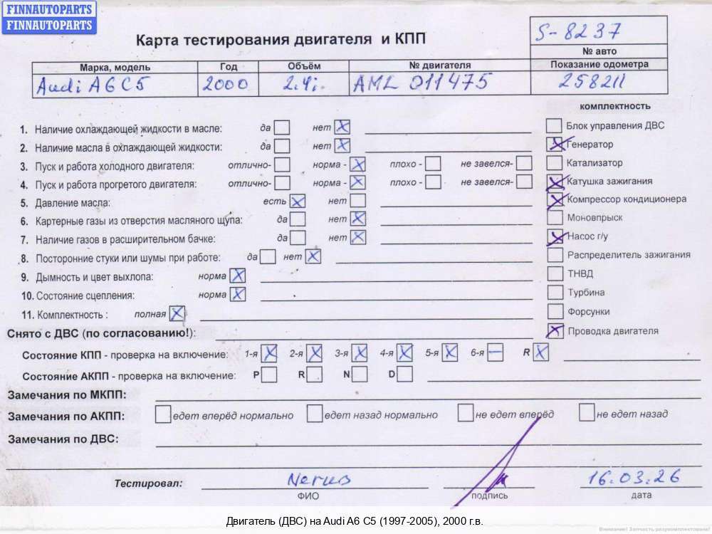 | Казань | 1999 | 078103101R, 1999, 2.4л, Бензин, Инжектор, ALF, ALF055106, 078103101R, Универсал, черный, Фото не актуально, с запчасти отделены: Маховик, Шланг, трубка гидроусилителя, Катушка зажигания, Генератор, Компрессор кондиционера, Насос гидроусилителя руля (ГУР), Форсунка топливная, ALF055106 | - , прокручивается, состояние ГРМ - нормально, поддон - нормально, клапанная крышка - нормально, эмульсия - нет, сломана декоративная крышка, бита муфта, бита катушка, сломана защита ГРМ, | |||