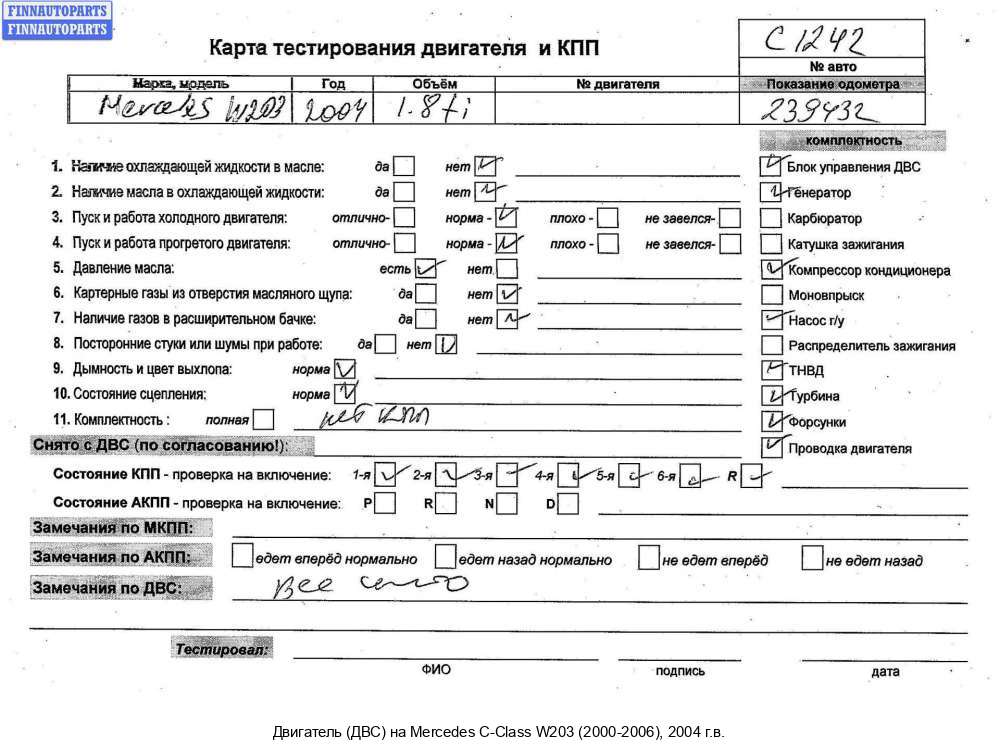 Компания FINNAUTOPARTS занимается продажей контрактных (б/у, бывших в употреблении) запчастей для иномарок. В нашей компании продаются только оригинальные запчасти из Европы, Японии и Кореи, которые не имеют пробега по РФ. Если вы хотите приобрести двигатель (ДВС) (бензиновый) для а/м Мерседес Бенц Ц (203 кузов), смело обращайтесь в нашу компанию. Все наши менеджеры — профессионалы своего дела, и с удовольствием помогут вам купить запчасти, в том числе, двигатели (ДВС) бензиновые, на Mercedes-Benz C (W203) и другие автомобили.