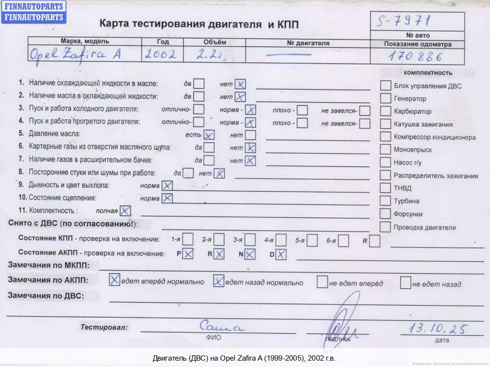 | Алматы (KZ) | 2001 | Z16XE02MT8176, 2001, 1.6л, Бензин, Инжектор, Z16XE, Z16XE02MT8176, Z16XE02MT8176, Минивэн, серебристый, Фото не актуально, с запчасти отделены: Генератор, Компрессор кондиционера, Z16XE02MT8176 | - | С | Т, прокручивается, состояние ГРМ - нормально , поддон - нормально , клапанная крышка - нормально , эмульсия - нет. скол разъема клапана ЕГР, | |||